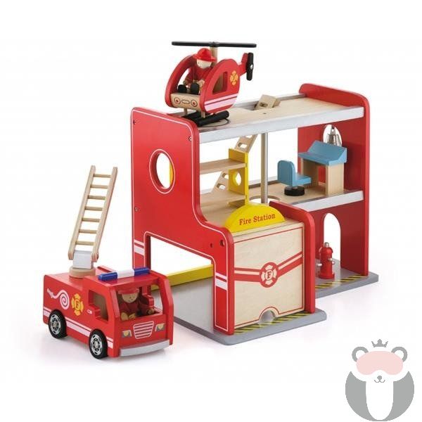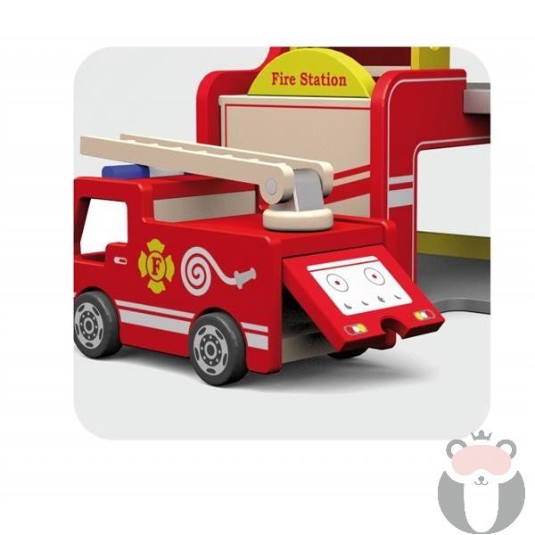- В комплекта има дървена пожарна станция и кола, хеликоптер, дървени фигурки - два пожарникара, пожарен кран и стълба, двойно легло, стол и бюро ;